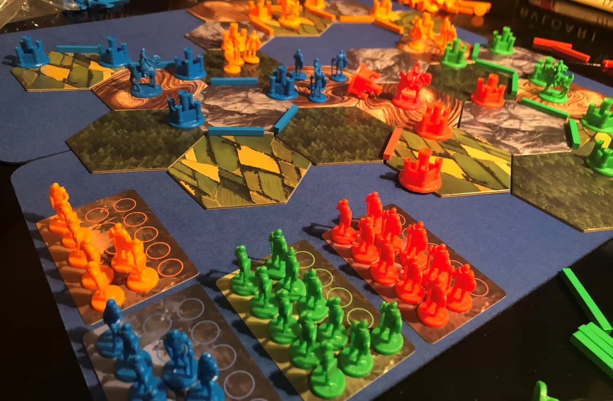 The map is constructed by the players by placing land tiles. This means the map is different in every game of Invasion! By placing castles on the land tiles, players collect different resources, which will allow them to build roads and castles, buy soldiers, and purchase advantage cards.