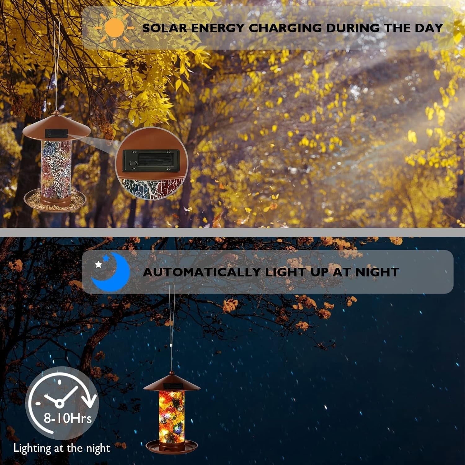 The birder feeder is solar-powered. The solar panel will be charged during the day and the light will automatically light up at night.