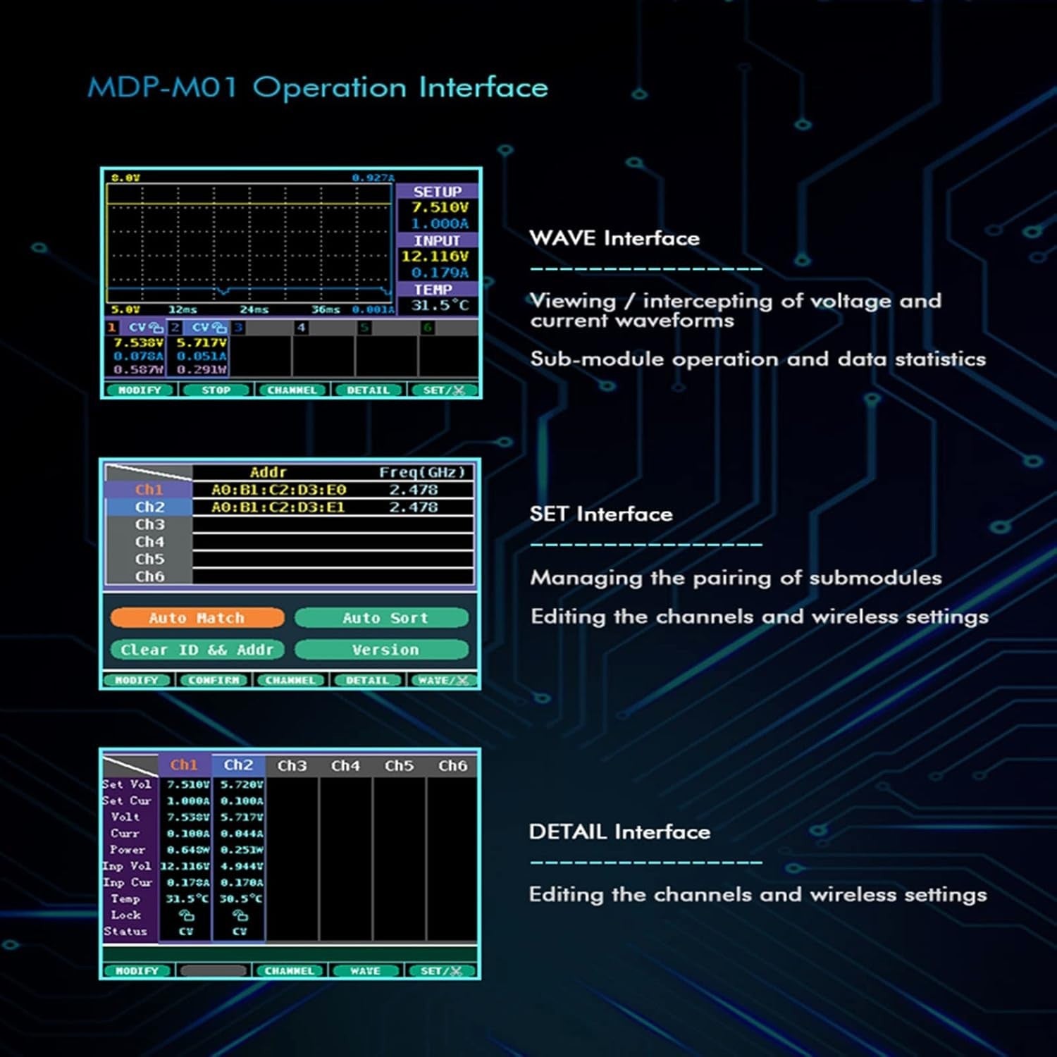 - MDP-M01 can realize online display and control with MDP-P905 mini digital power supply module and other modules of MDP system through 2.4G wireless communication