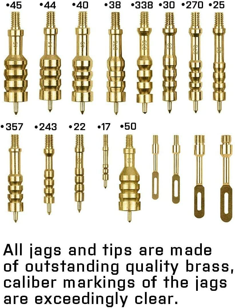 - Durable: Gun Cleaning Kit with Full Brass Jags - Tired of plastic jags breaking off in your rods. All jags and slotted tips are made from solid brass (no more bent and broken plastic jags) and clearly marked what caliber to use it on(never guess again).
